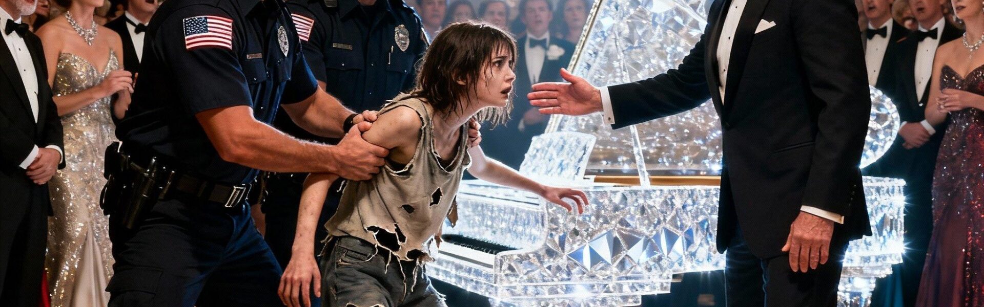 The gala at the Harrington Hall was meant to be a celebration of elegance—crystal chandeliers, flowing gowns, champagne glasses clinking like delicate bells. But the room froze when two security guards dragged in a trembling, dirt-streaked girl who looked no older than fifteen. Her hair was tangled, her clothes thin and patched. Yet her eyes—sharp, focused—were fixed not on the judgmental crowd, but on the grand Steinway piano at the center of the stage.