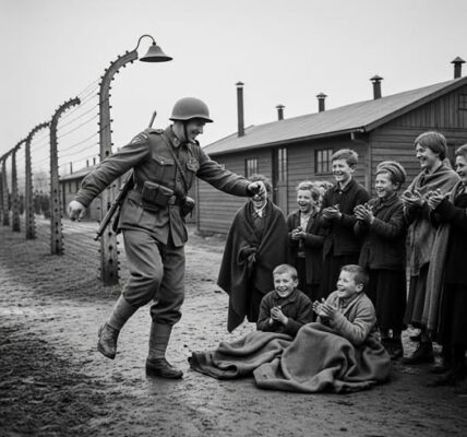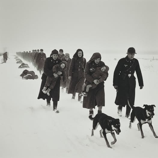 Czarna linia strażników rozstąpiła się, aby wpuścić kolumny kobiet, mężczyzn i dzieci. Śnieg był wysoki, gęsty, lepki, jakby sam stawiał opór wobec brutalności nadchodzącego marszu. Matki niosły dzieci, które ważyły mniej niż cienie. Na ich twarzach malowała się sinica, w ustach zamarzał oddech, a niskie temperatury przenikały przez cienkie ubrania obozowe jak nóż. Obok nich szli mężczyźni – skrajnie wycieńczeni, z oczami wpatrzonymi w przestrzeń, jakby strach przestał mieć dla nich wymiar emocji, a stał się jedynie suchym faktem.