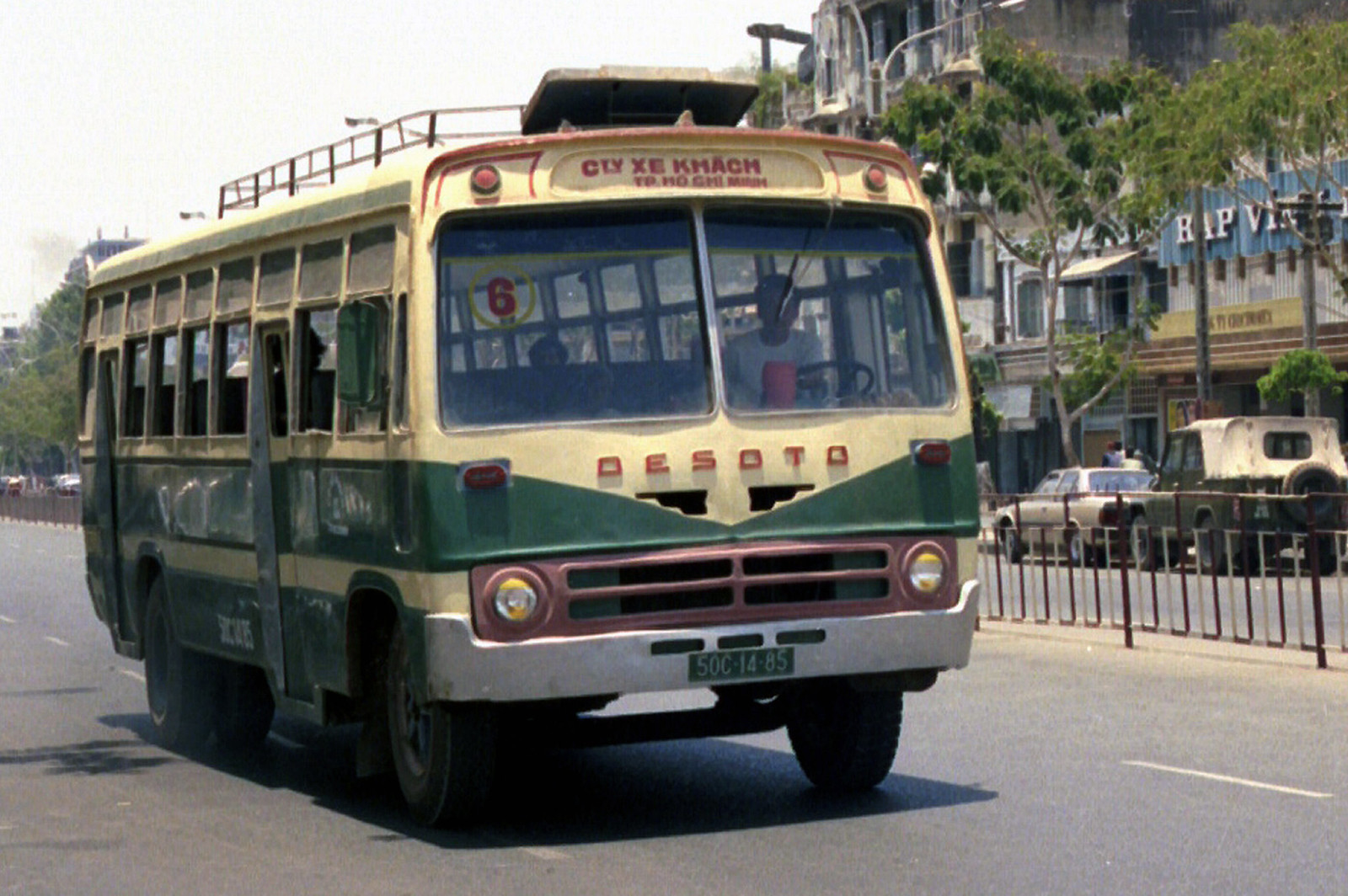 Xe buýt Desoto biển số 50C-14-85 của Công ty Xe khách TP HCM chạy trên một con đường ở TP HCM năm 1990. Desoto là một thương hiệu xe của Mỹ, ngày nay đã “biến mất” trên thị trường.
